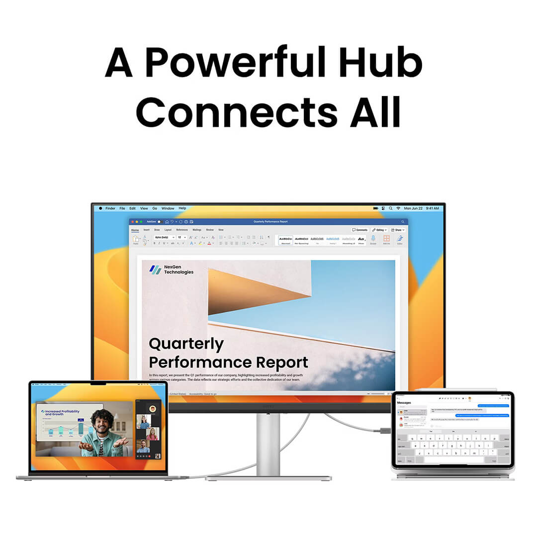 More than a stylish external monitor for your MacBook, it’s also a powerful hub for your desktop Apple ecosystem. The built-in 15W hub charges your iPad and iPhone while you work.