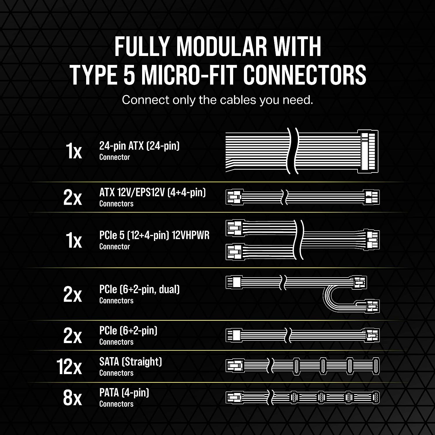 Fully modular, CORSAIR Type 5 Gen 1 micro-fit PSU cables, so you only connect the cables your system needs while taking up less space.