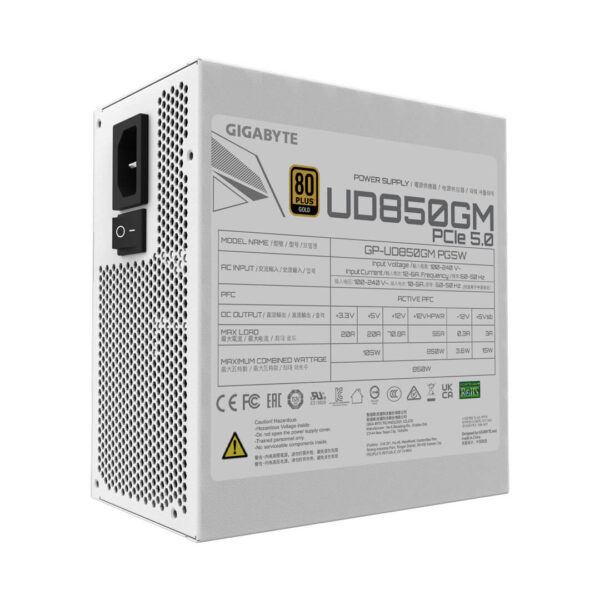 The UD850GM PCIE 5.0 WHITE EDITION can sustain up to 2x total power excursion. It is fully compatible with Intel PSDG (Power Supply Design Guide) ATX 3.0 standard which supports up to 200% power excursion, reaches 70% low load efficiency and complies with required power supply timing standards.